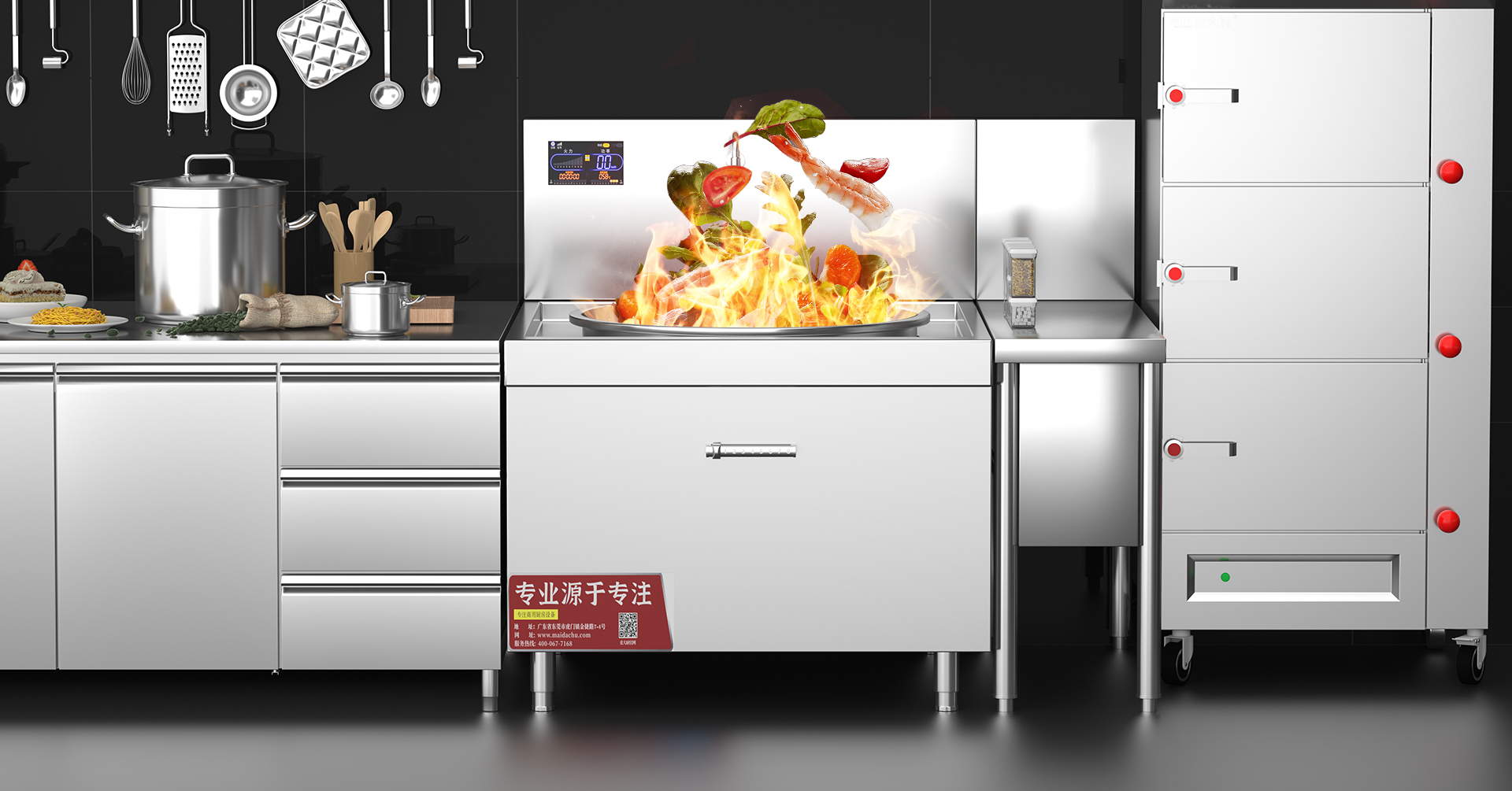 麦大厨厨房设备厂家研发、设计、生产、安装和服务一站式解决。