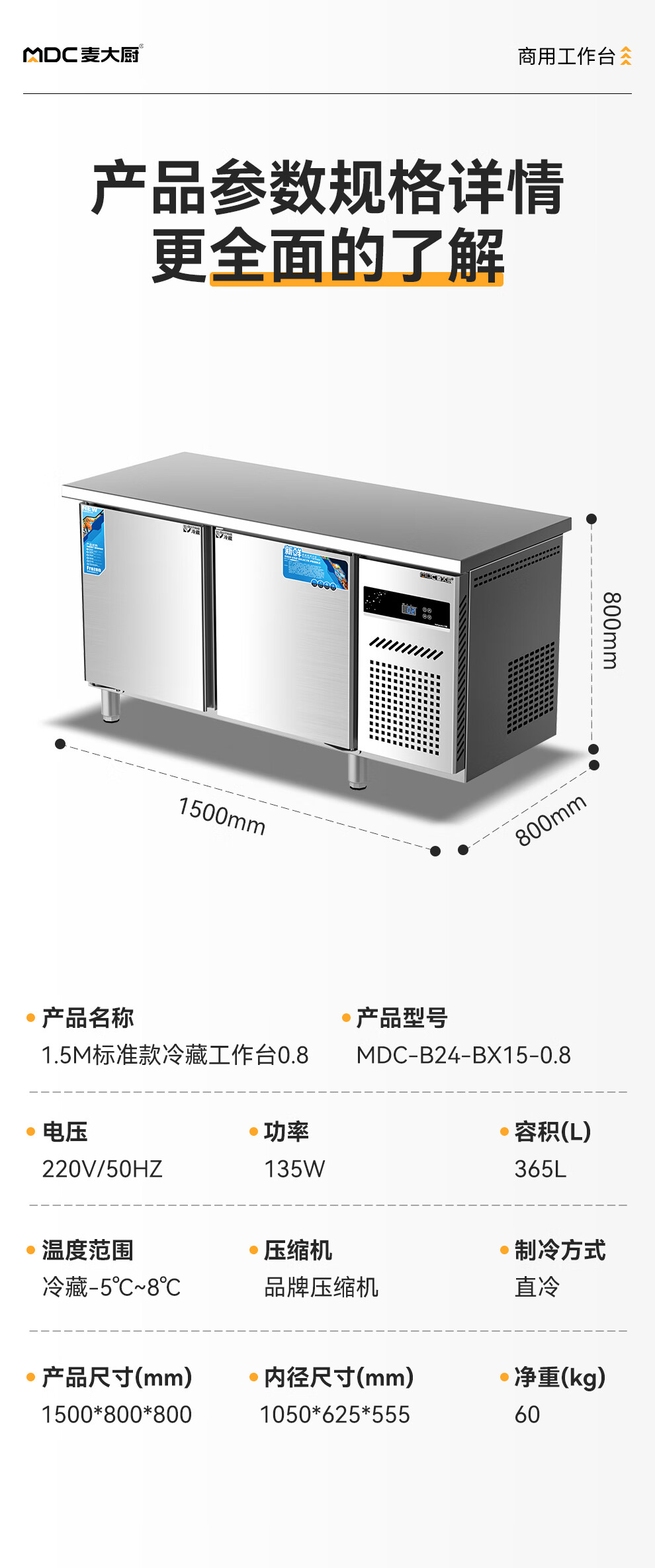 麦大厨1.5M标准款135W直冷冷藏工作台0.8