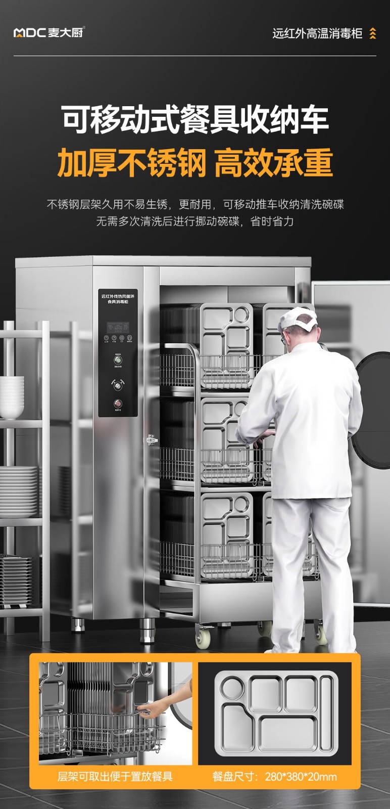 麦大厨380V工程款单门单控3层推车式远红外线热风循环高温消毒柜4.5KW