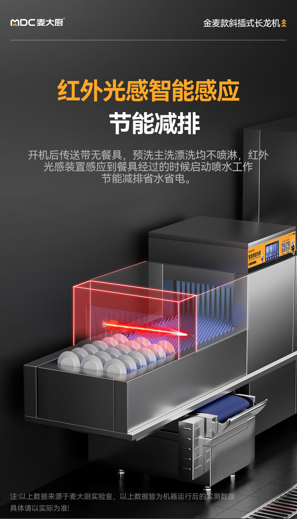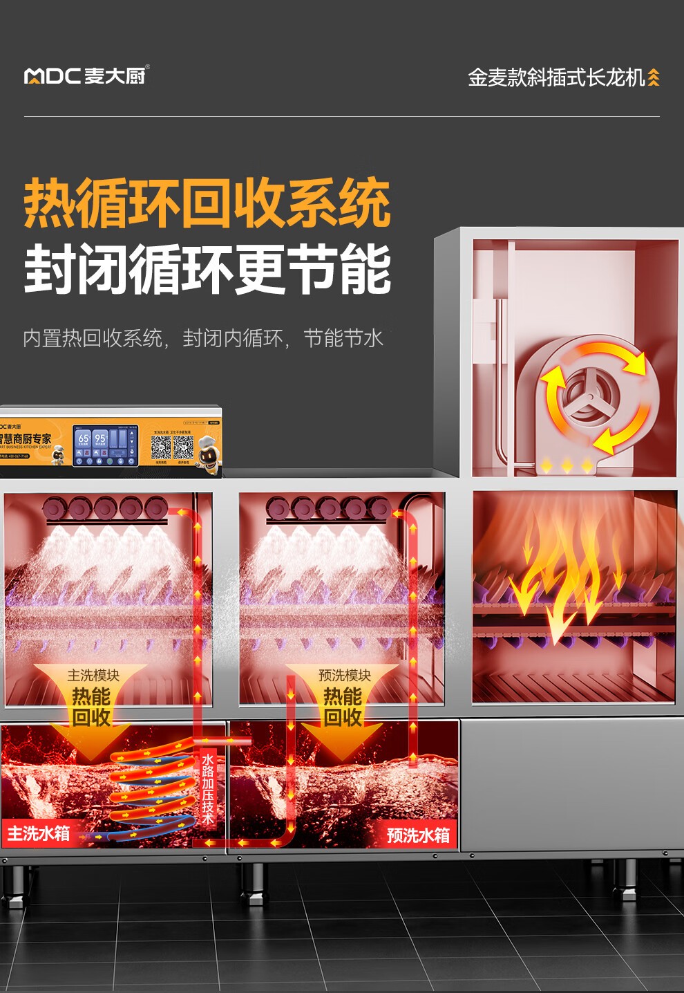 麦大厨金麦款平放式触屏热回收5.95m三缸双喷双烘带除渣洗碗机